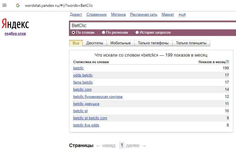 Количество брендовых запросов названия компании на английском языке "BetClic" на Вордстарт Яндекс Ру составляет 199 показов за месяц.