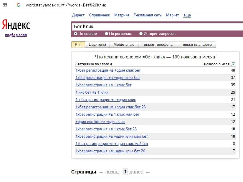 Количество запросов по бренду названия компании на русском языке "Бет Клик" на wordstat yandex ru составило также 199 запросов за месяц.