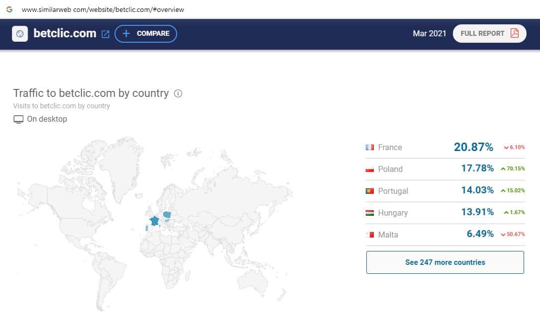 При проверке посещаемости интернет-ресурса мошеннической организации BetClic на similarweb com оказалось, что среди трафика есть пользователи из Франции и Польши.