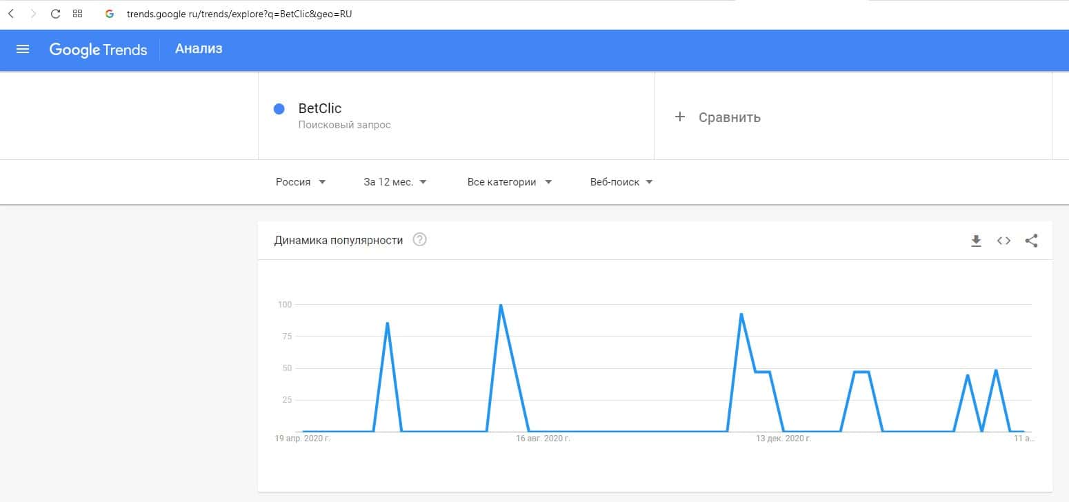 Динамика количества запросов по бренду названия компании на английском языке "BetClic" на trends google ru отображена на графике предоставленном ниже.
