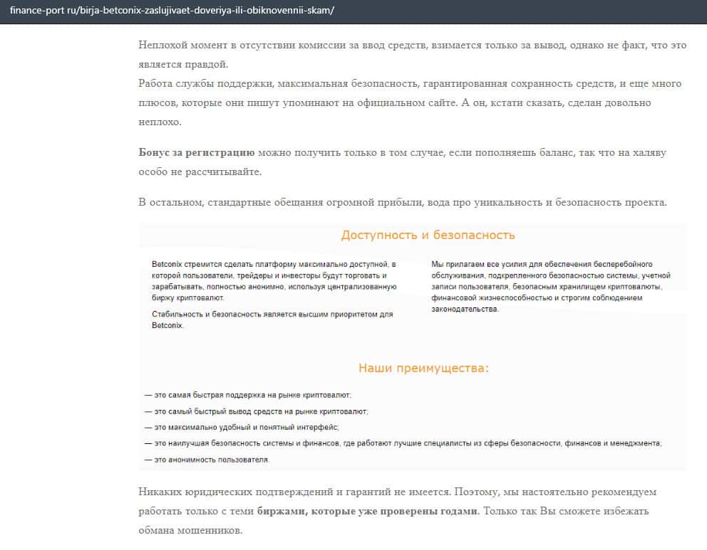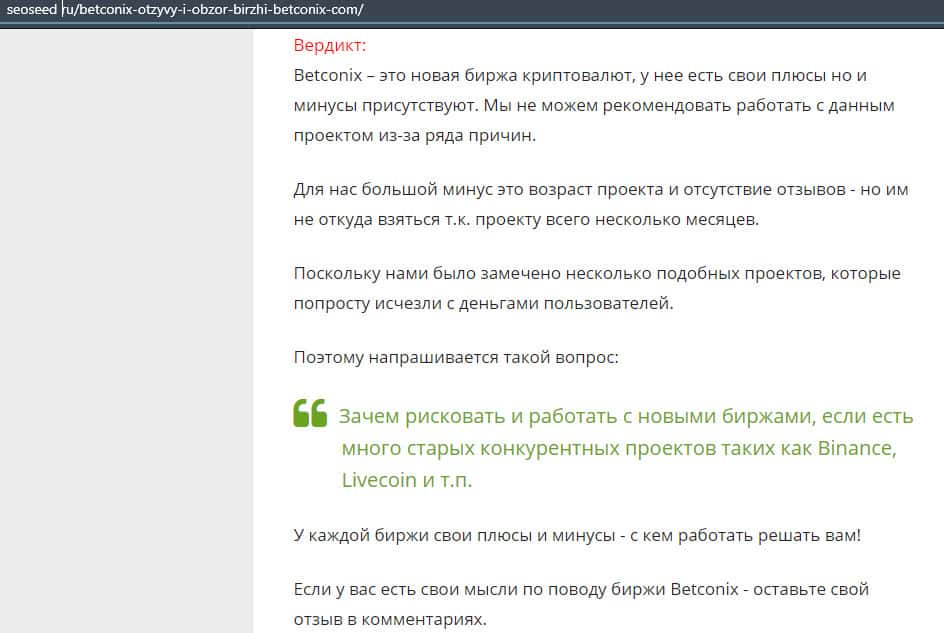 Ниже вы можете ознакомиться еще с одной статьей о псевдобирже BetConix, где указывается, что данный проект подозрительный и связываться с ним не стоит.