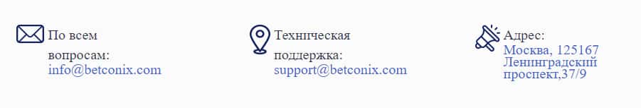 Далее представлены контактные данные, которые криптовалютный лохотрон BetConix предлагает своим клиентам. Там вы можете найти как две электронные почты, так и адрес: