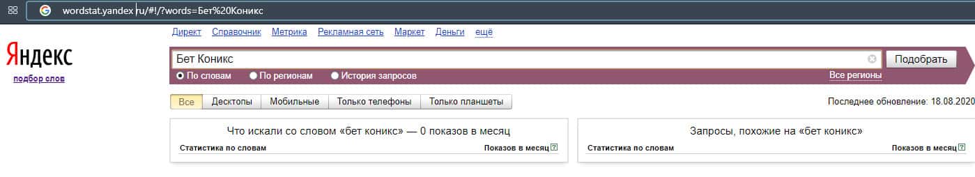 Ну и те же самые показатели, если ввести бренд лохотрона "Bet Conix" с пробелом. Мошенники по такому запросу не популярны и статистики по нему нет.