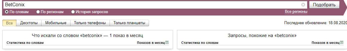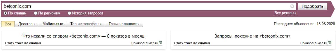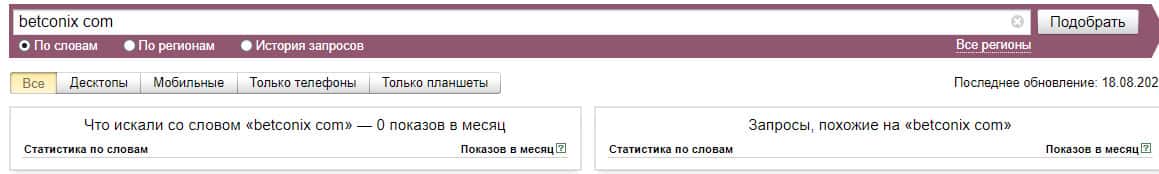 Тот же самый результат показал бренд "betconix com", 0 показов в месяц и это вообще ничтожный показатель, так как это не биржа, а лохотрон.