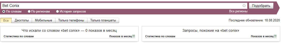 Что касается немного другого бренда "Bet Conix", в Яндекс также нет никаких запросов и контору можно считать вообще не популярной.