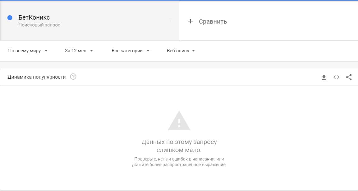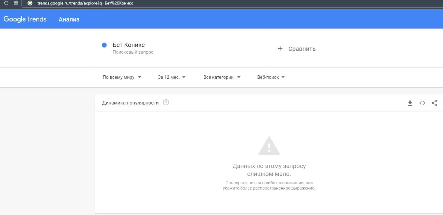 В поисковой системе Гугл, мошенники под брендом "Бет Коникс" непопулярны вообще и набрали 0 запросов за месяц.