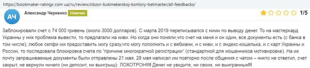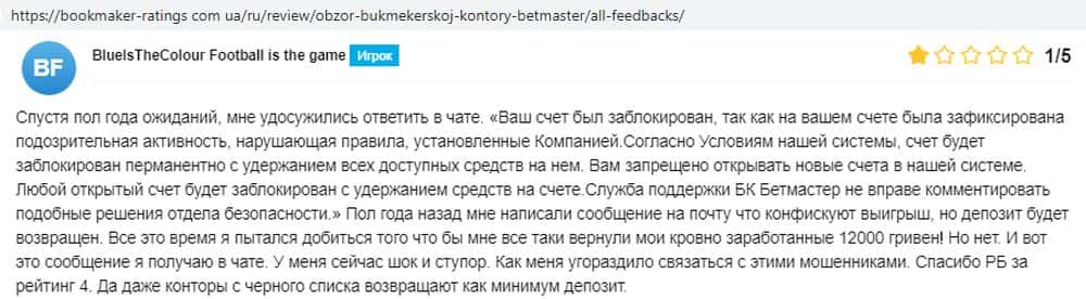 Даже опытные игроки говорят, что раньше не сталкивались с таким нахальством. Ведь аферисты Бет Мастер не просто блокируют счет, они оставляют себе личные средства игрока.