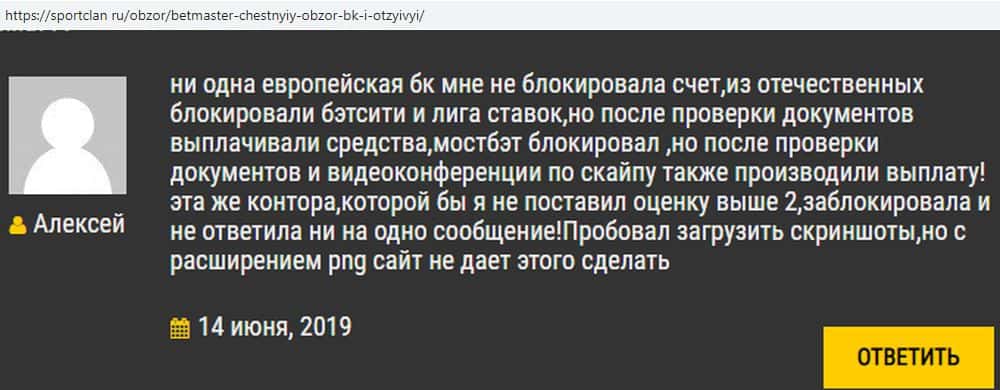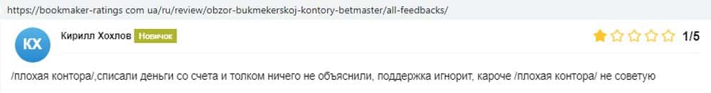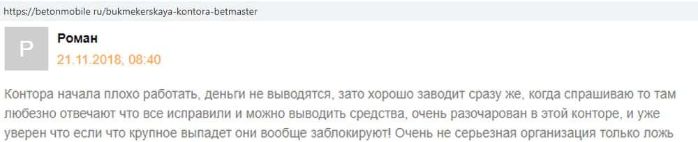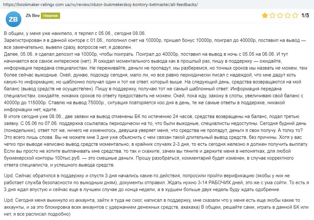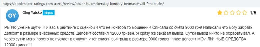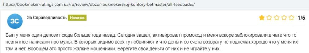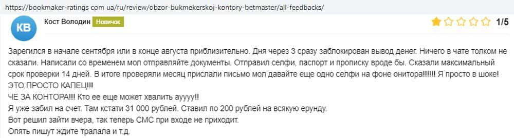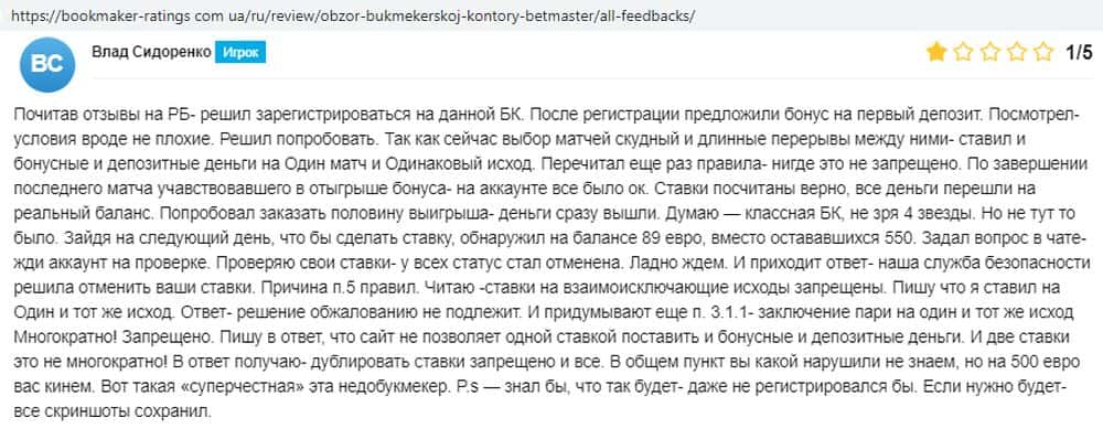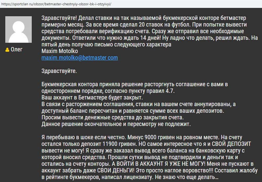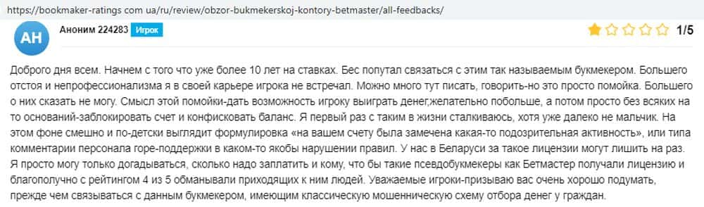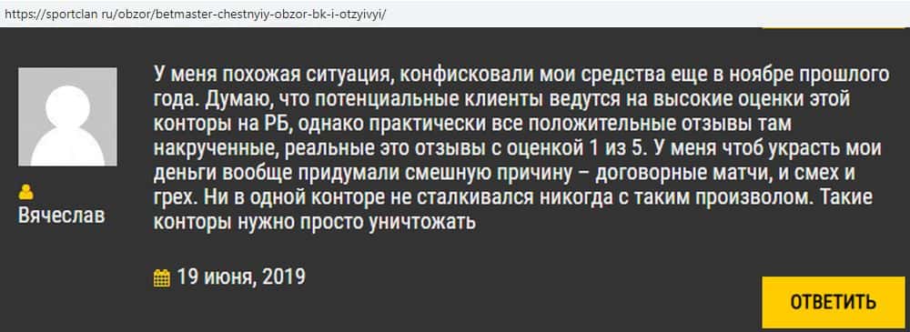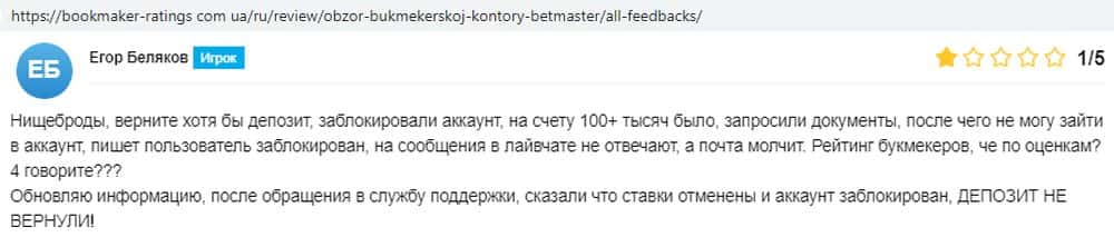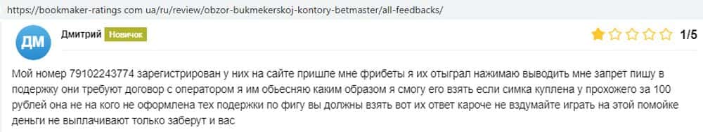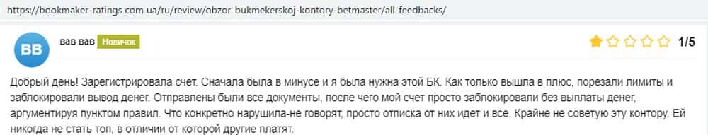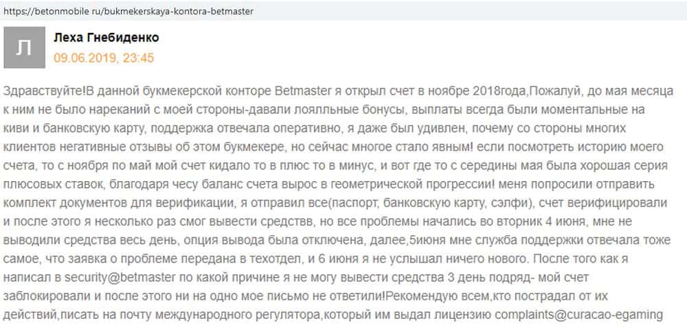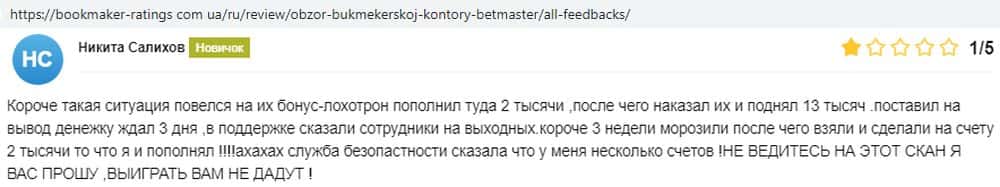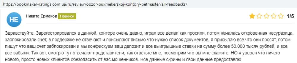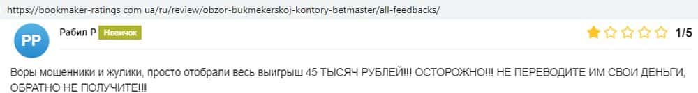 Многие пользователи считают, что авантюристы Бет Мастер занимаются беспределом. Как иначе назвать то, что мошенники отбирают не только выигрыш, но и личные средства игроков.