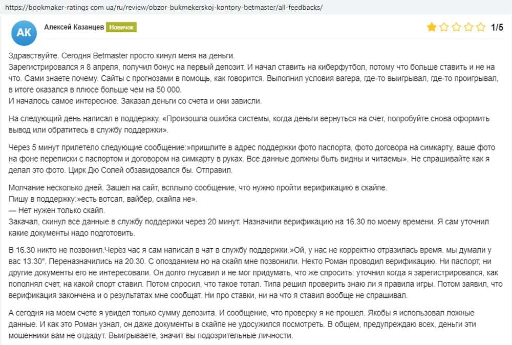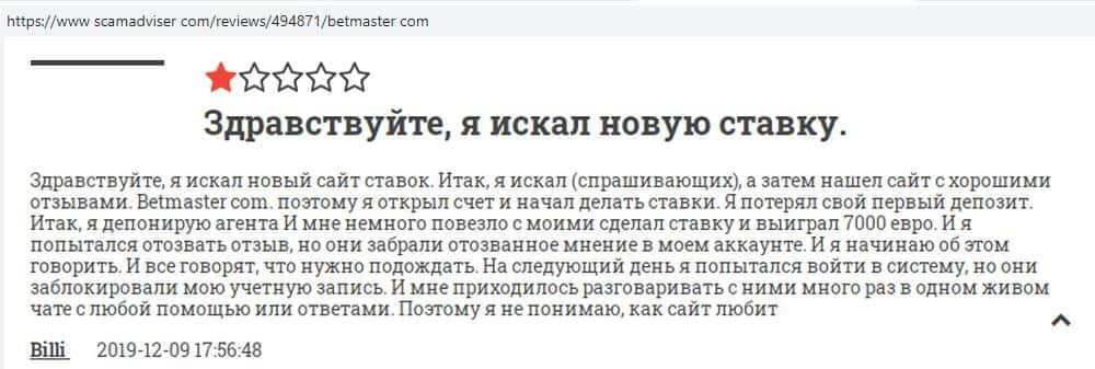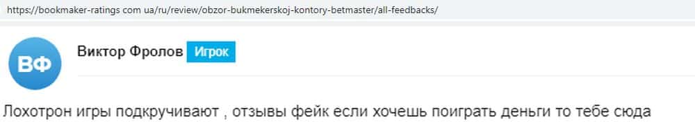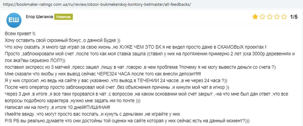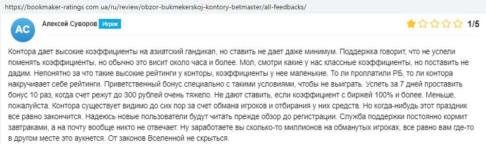 Большинство обзоров в сети заказные и нахваливают шулеров Бет Мастер, которые нагло обирают игроков. Но некоторые сайты все же говорят правду и советуют держаться подальше.