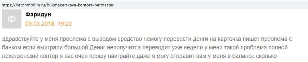 Многие игроки не стесняются в выражениях, описывая деятельность разводил Bet Master, и это не удивительно. Ведь речь идет о крупных суммах на депозите, иногда о тысячах долларов.