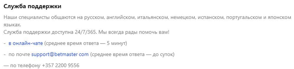 Единственный номер телефона (код того же Кипра, кстати) найти на сайте махинаторов Бет Мастер не так просто - он почему-то упоминается всего раз в разделе о службе техподдержки: