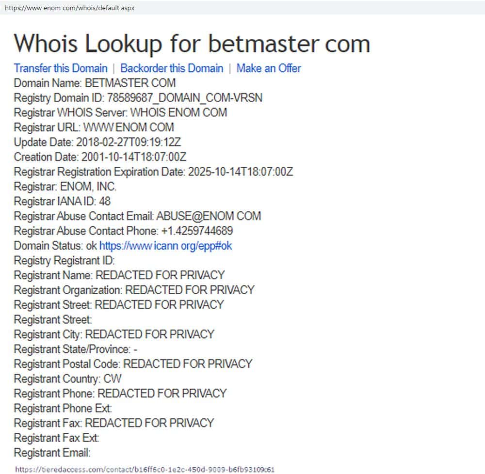 Спекулянты Bet Master скрыли данные о владельце домена при помощи платных сервисов. Это является одним из очевидных признаков лохотрона, солидные конторы так не делают.