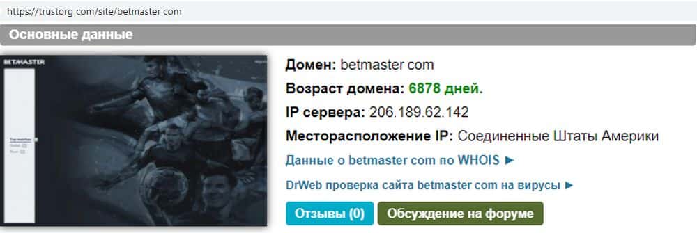 Ресурс трасторг ком показывает, что сайту кидал Бет Мастер около 18 лет. Но это не значит, что скам-проект существует так долго. Скорее всего, они просто перекупили возрастной домен.