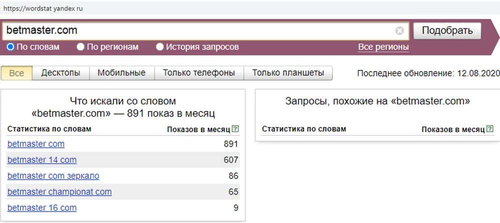 Домен мошенников Bet Master пользуется меньшей популярностью из-за блокировок и зеркал. Запрос "betmaster com" за прошедший месяц в выдачу Яндекс попадал 891 раз.