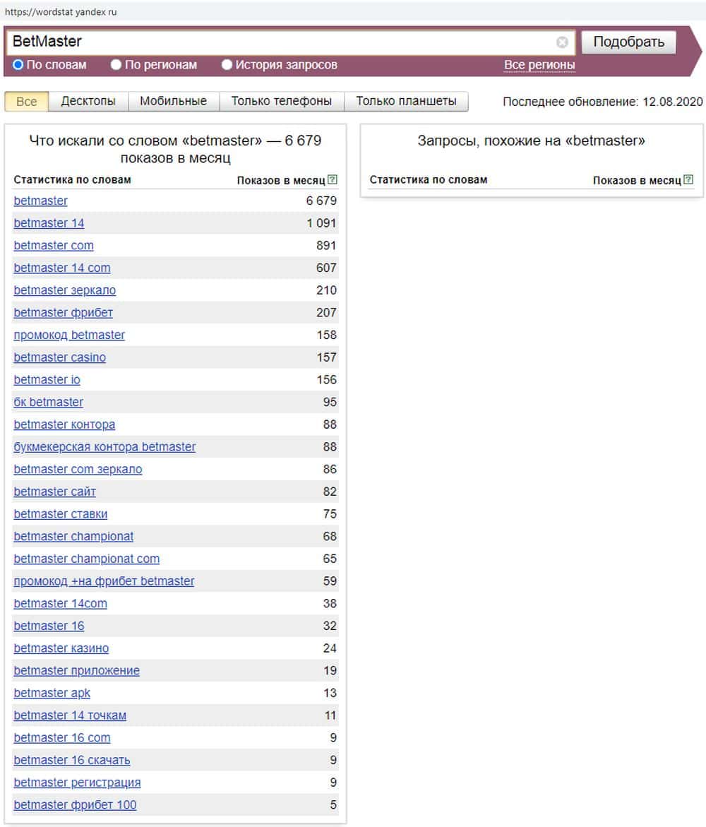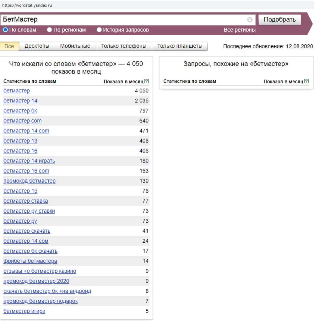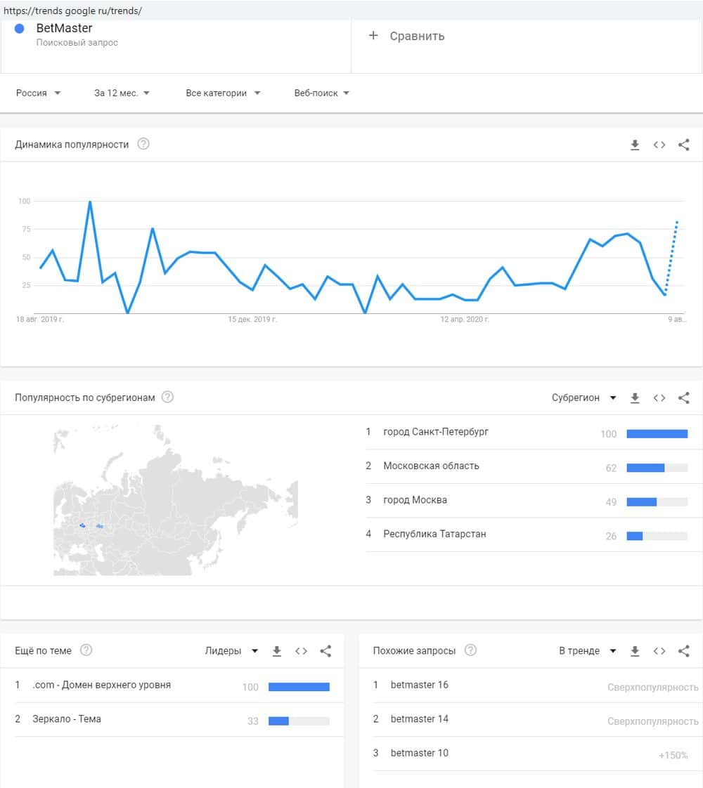 Высокая активность из того же города наблюдается и по запросу "БетМастер". Как показывает сервис, игроков интересуют зеркала лохотрона и отзывы реальных пользователей.