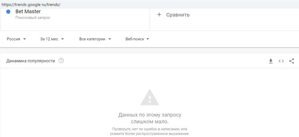А вот по запросу "Bet Master" липовый букмекер среди русскоязычных пользователей Гугл не популярен - ни одного показа за прошедший год, согласно онлайн-проекту trends google ru.