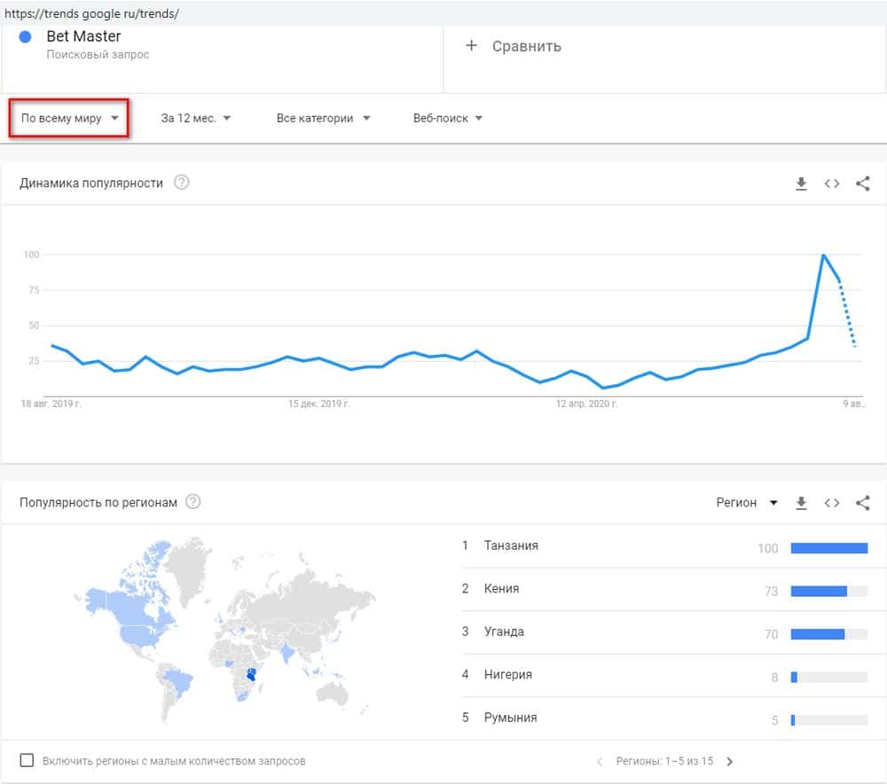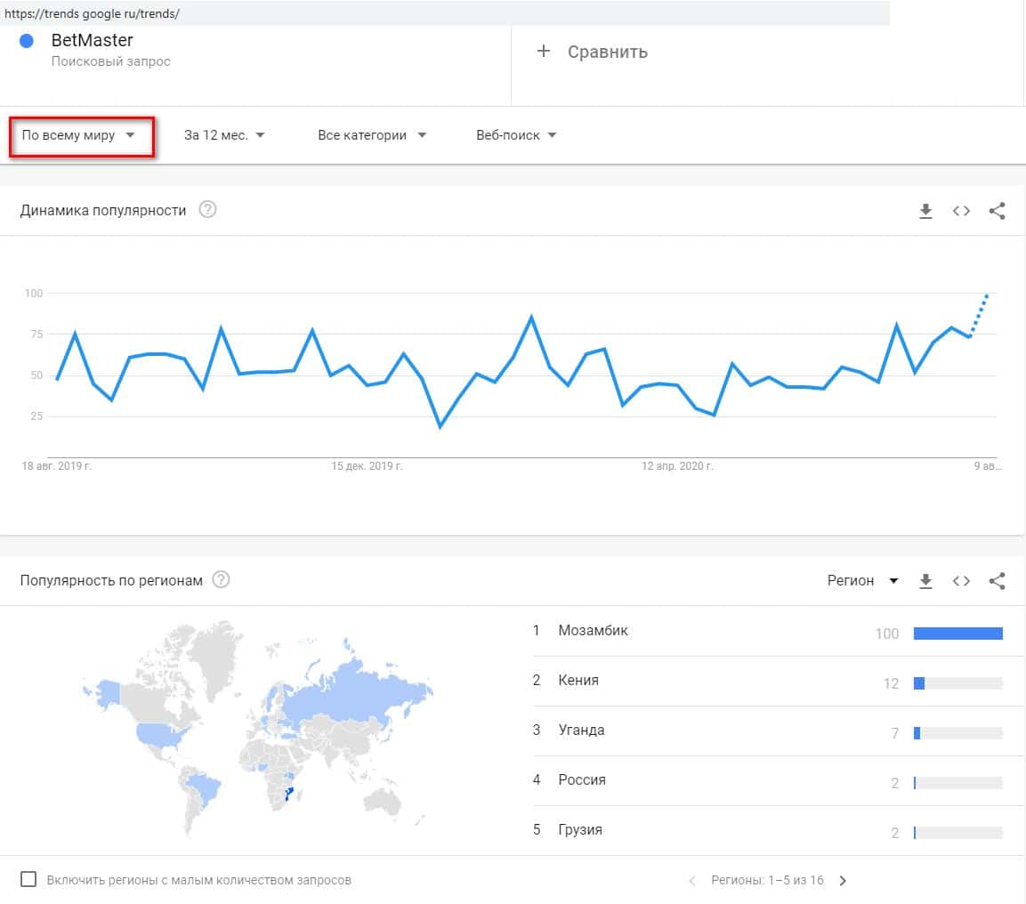 При проверке этого же запроса "Bet Master" по всему миру видим, что основное количество жертв жулики Бет Мастер получают из африканских стран, и малую часть из России и Грузии.