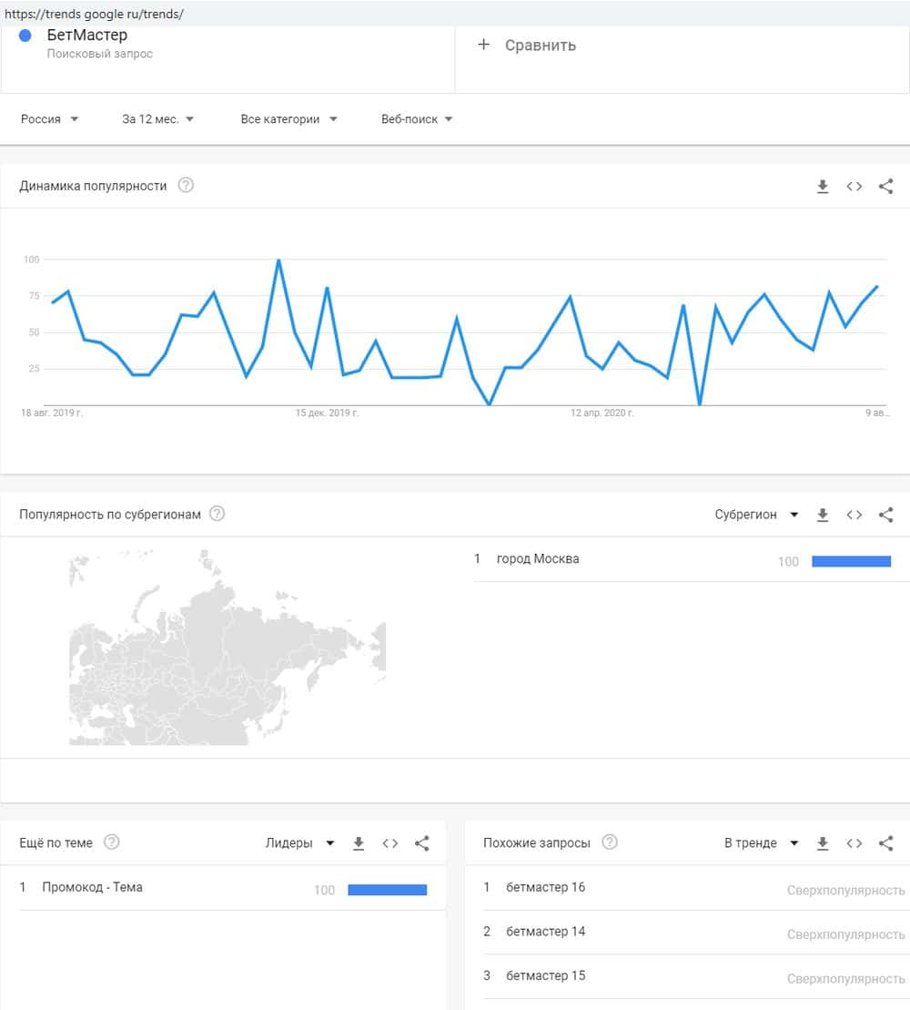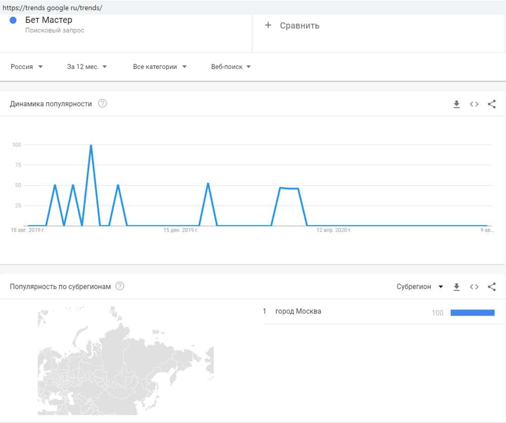 По запросу "Бет Мастер" пользователи Гугл обращались к поисковику в начале года, потом интерес к скам-конторе утих из-за жалоб от пострадавших. Запросу шли в основном из Москвы.