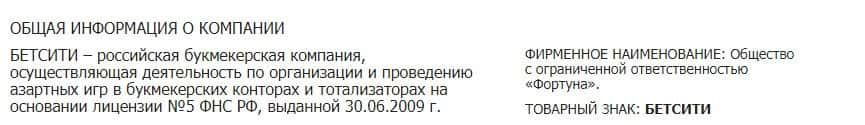 Официальным юридическим лицом, которое ведет дела с клиентами от имени Бет Сити является ООО "Фортуна".