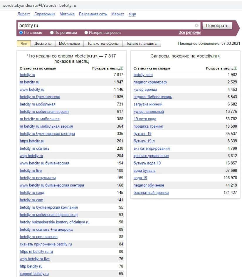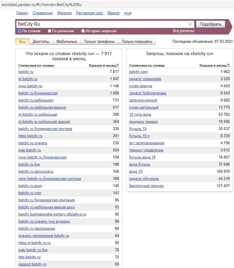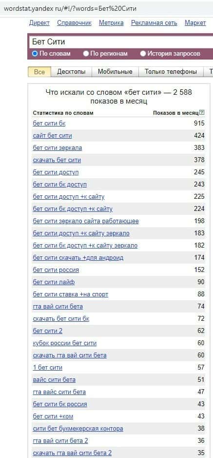 - Какое количество запросов по betcity ru выдает Яндекс?