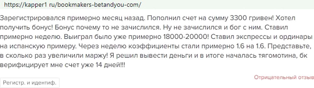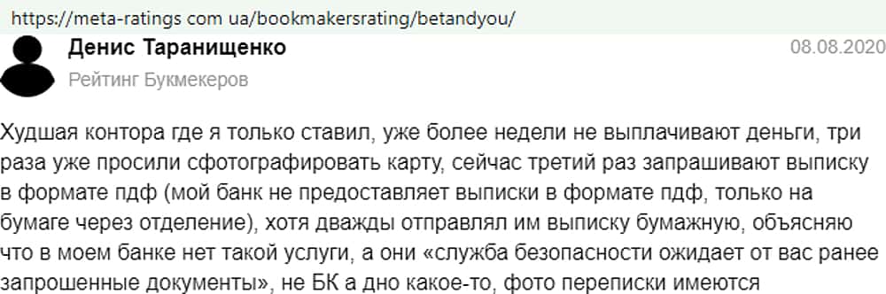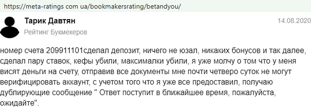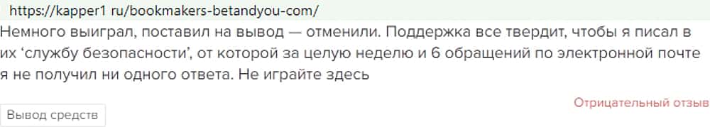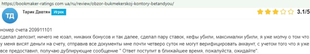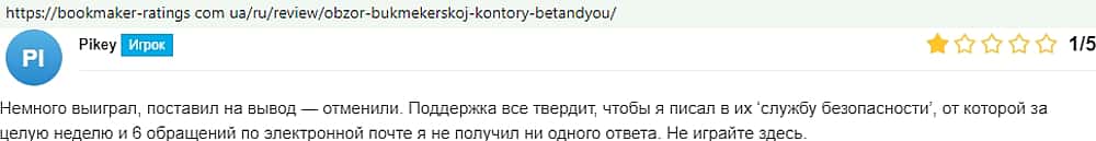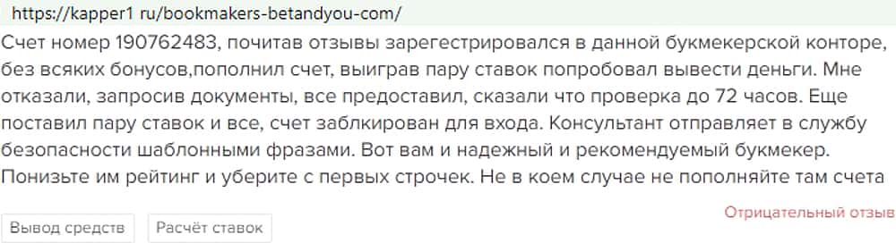 Под любым предлогом аферисты Бетанд Ю будут отказывать в выводе средств. Они могут затягивать с процессом верификации до тех пор, пока жертва их дешевой авантюры не сдастся.
