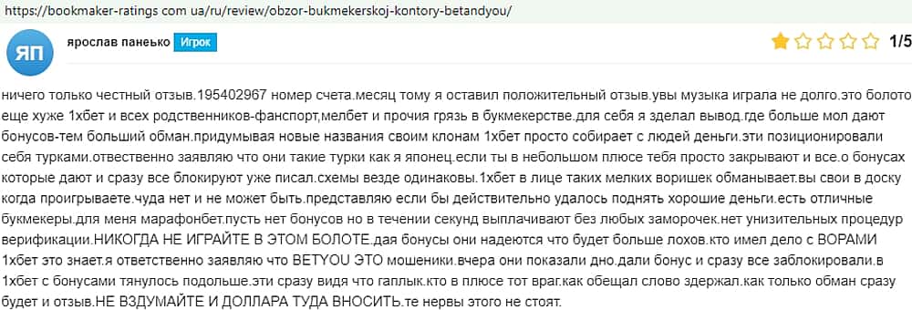 Пользователи сети считают, что ложный букмекер Бетанд Ю должен иметь самый низкий рейтинг, который только можно получить потому, что этот проект чистой воды мошенничество.