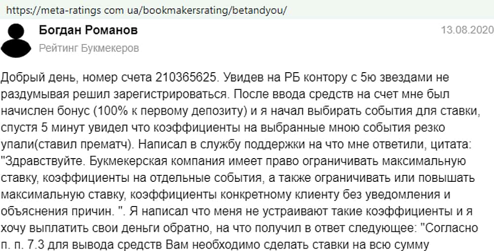 Разрешая выводы мелких сумм выигрышей, шарлатаны Бетанд Ю просто имитируют честного букмекера. На деле же они просто ждут большой депозит, который сразу же блокируют.