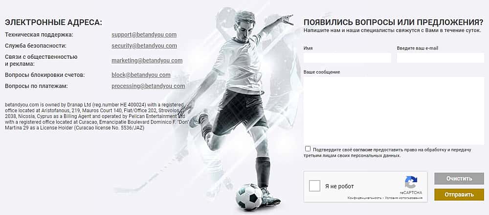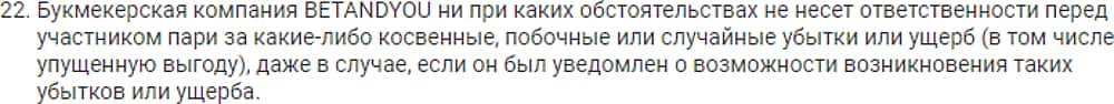 Всю ответственность за убытки и ущерб, которые игрок получил в помойной яме betandyou com, махинаторы Бетанд Ю перекладывают на самого участника спортивного тотализатора.