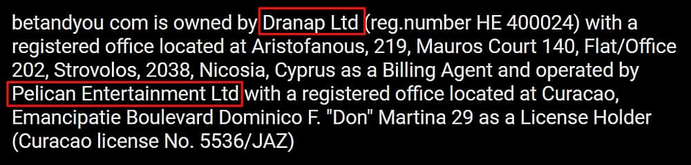 Шарашкиной конторой Бетанд Ю, которая кидает игроков на деньги, рулит некая компания Dranap Ltd. Всеми платежными транзакциями заведует организация Pelican Entertaiment Ltd.