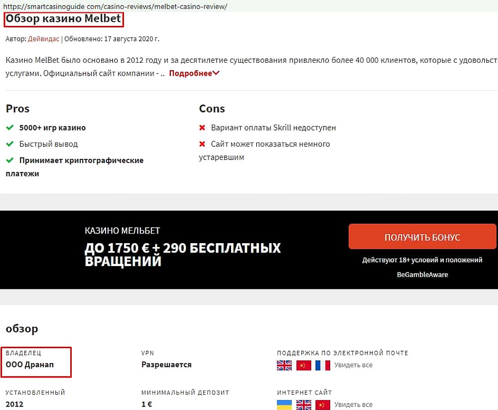 Букмекерская контора с подмоченной репутацией Мел Бет, как оказалось, принадлежит той же компании, которая обозначена мошенниками Бетанд Ю в качестве своей управляющей.
