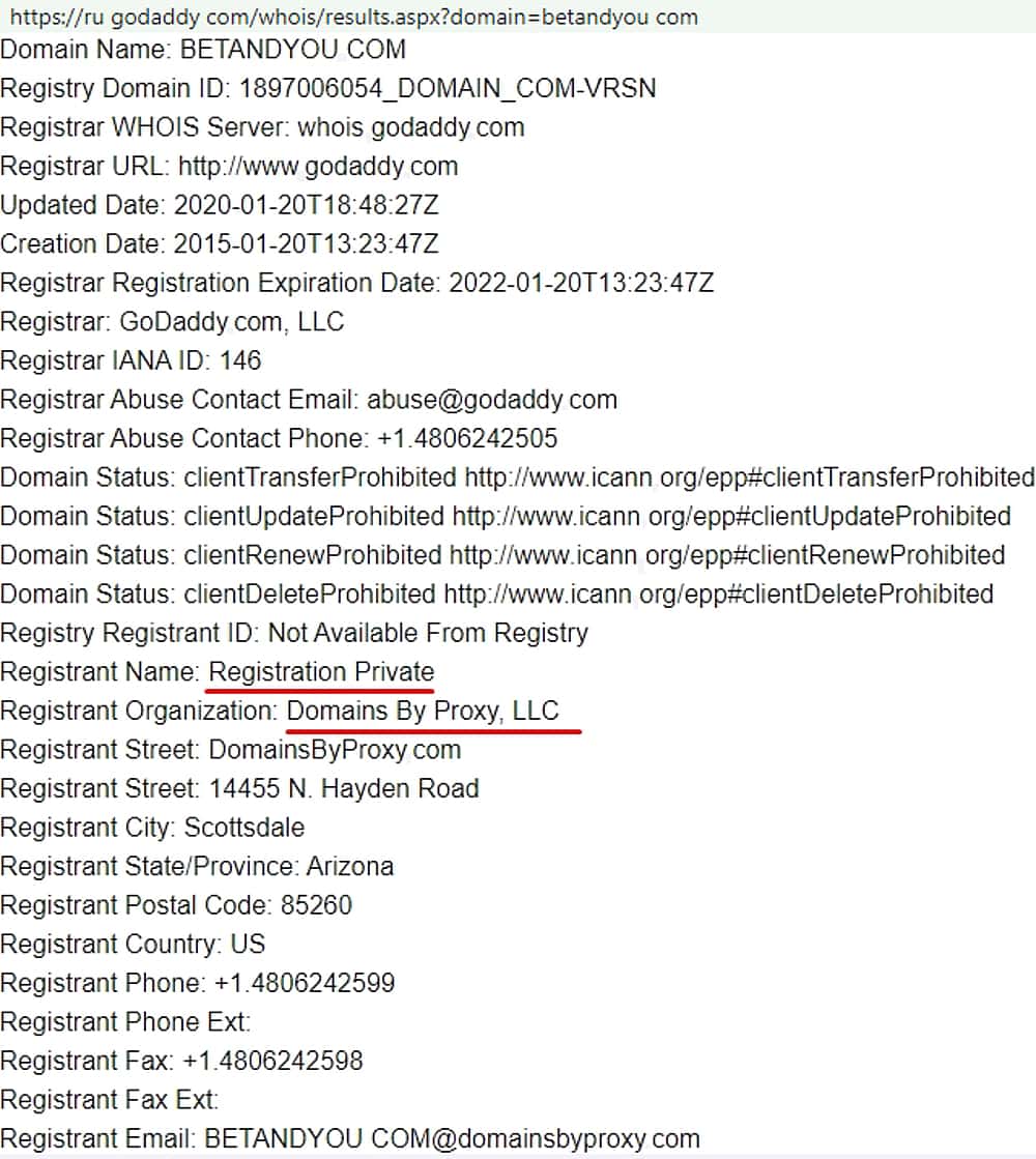 Как и стоило ожидать, доменное имя букмекерской лоховозки принадлежит неизвестно кому. Человек, владеющий им, предпочел скрыть свою личность, как делают все мошенники.