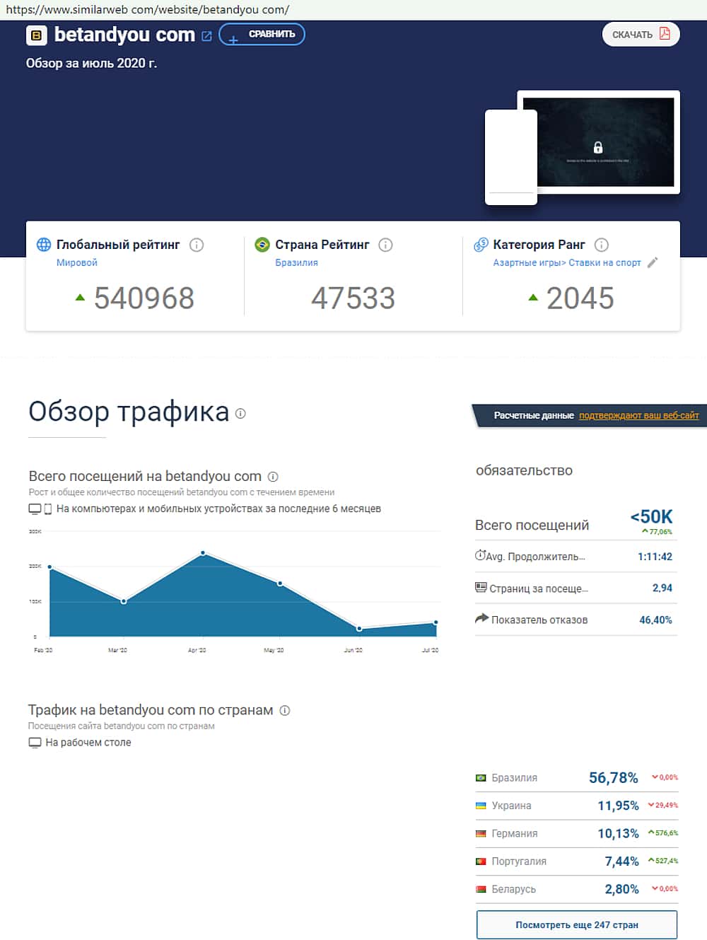 Лоходром Бетанд Ю наибольшей популярностью пользуется у жителей Бразилии, а вот на втором месте находится Украина. Но все же игровая афера BetandYou имеет низкий рейтинг.