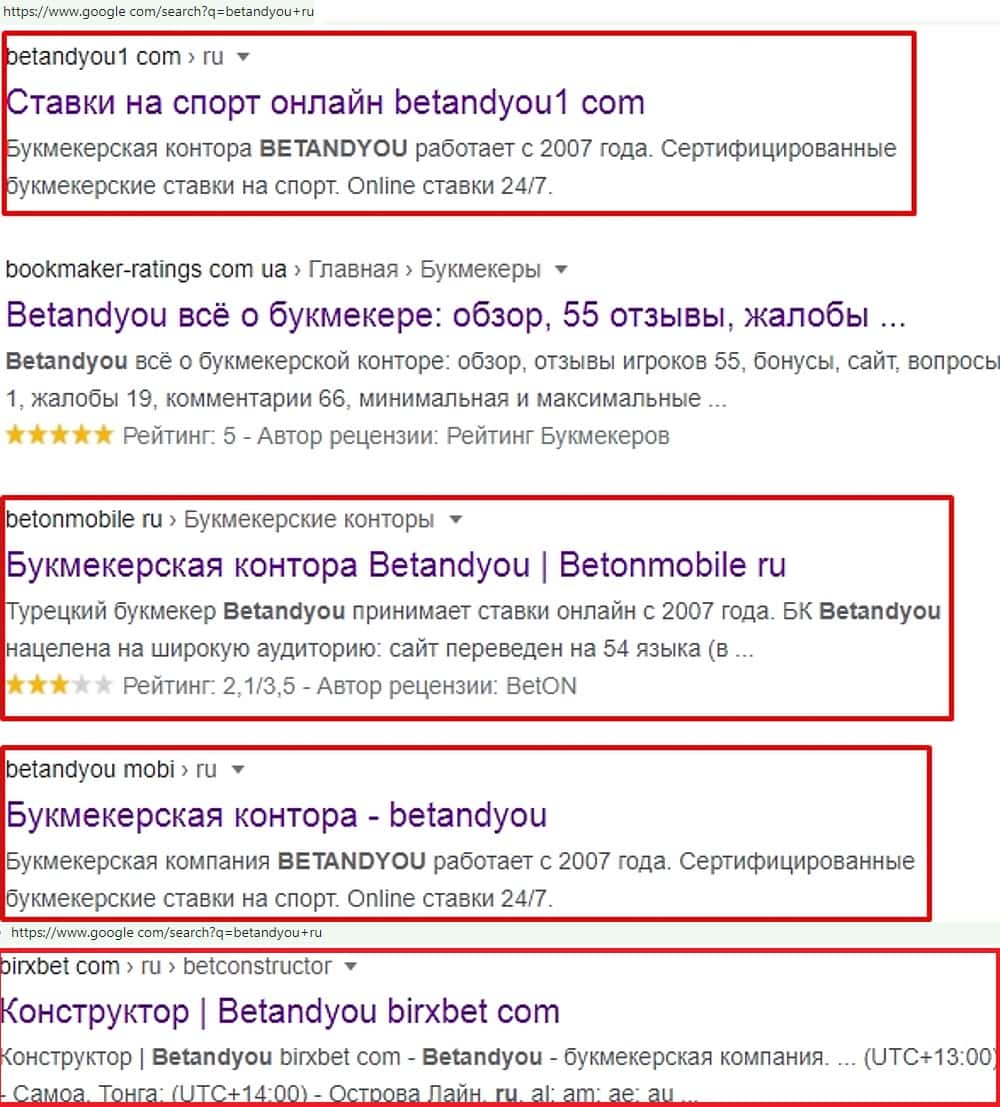 Анализ варианта запроса "Bet and You" получил огромное количество результатов, вот только в этом море выдачи лоховодов Бетанд Ю не оказалось. Только другие мошенники.
