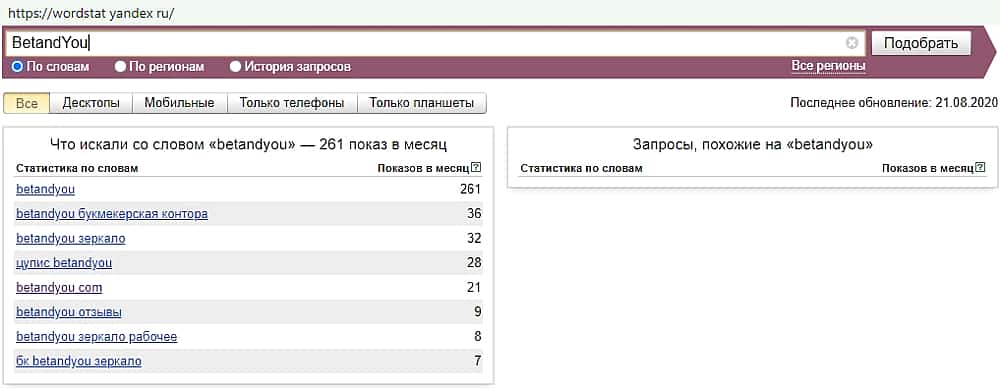 Поисковый запрос "betandyou com" не нашел себе поклонников среди пользователей поискового сервиса Яндекс. Это хорошо, что люди не пытаются искать очередной лохотрон.
