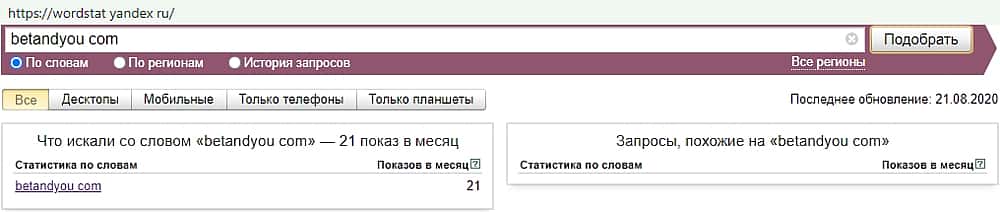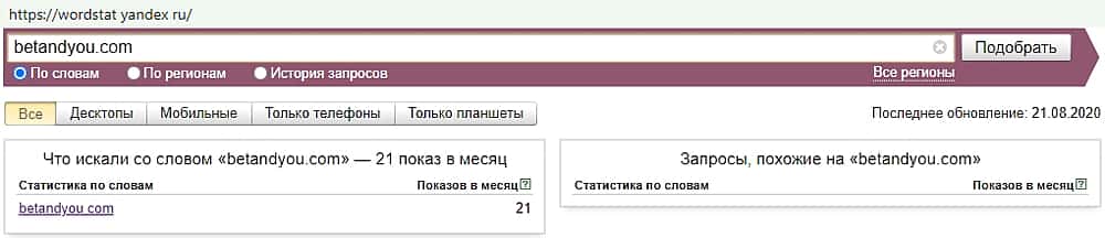 Букмекерским лохотроном по запросу "betandyou com" интересовался всего лишь 21 юзер, предпочитающий поиск Yandex. Это очень низкий показатель популярности для тотализатора.