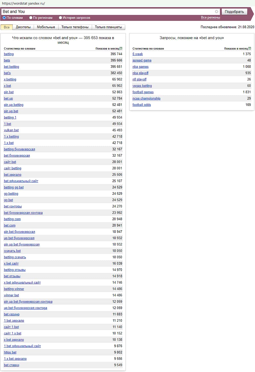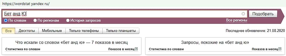 И 7 раз фигурировал запрос "Бет анд Ю" в строке поисковой нейросети Яндекс. Глядя на эту непопулярность, можно смело проходить мимо низкопробного букмекерского обувалова.