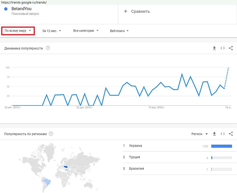 Немногим лучше для аферистов оказалась ситуация с поиском их недобренда "BetandYou" жителями стран СНГ. Каталы набрали 261 запрос по поиску их дешевого псевдототализатора.