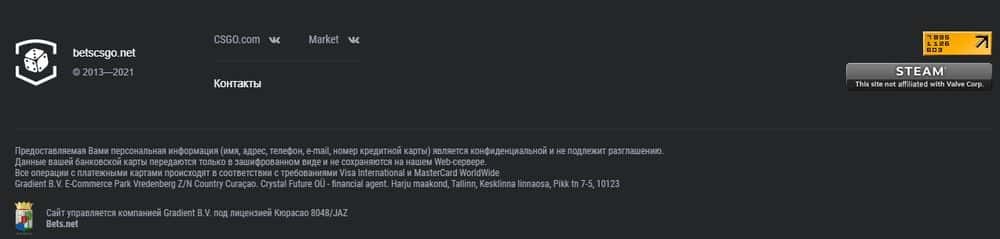 В подвале сайта можно заметить, что шарлатаны Бетс КСГО имеют не только регистрацию на оффшроном Кюрасао, но и в такой же оффшорной, свободной от налогов Эстонии: