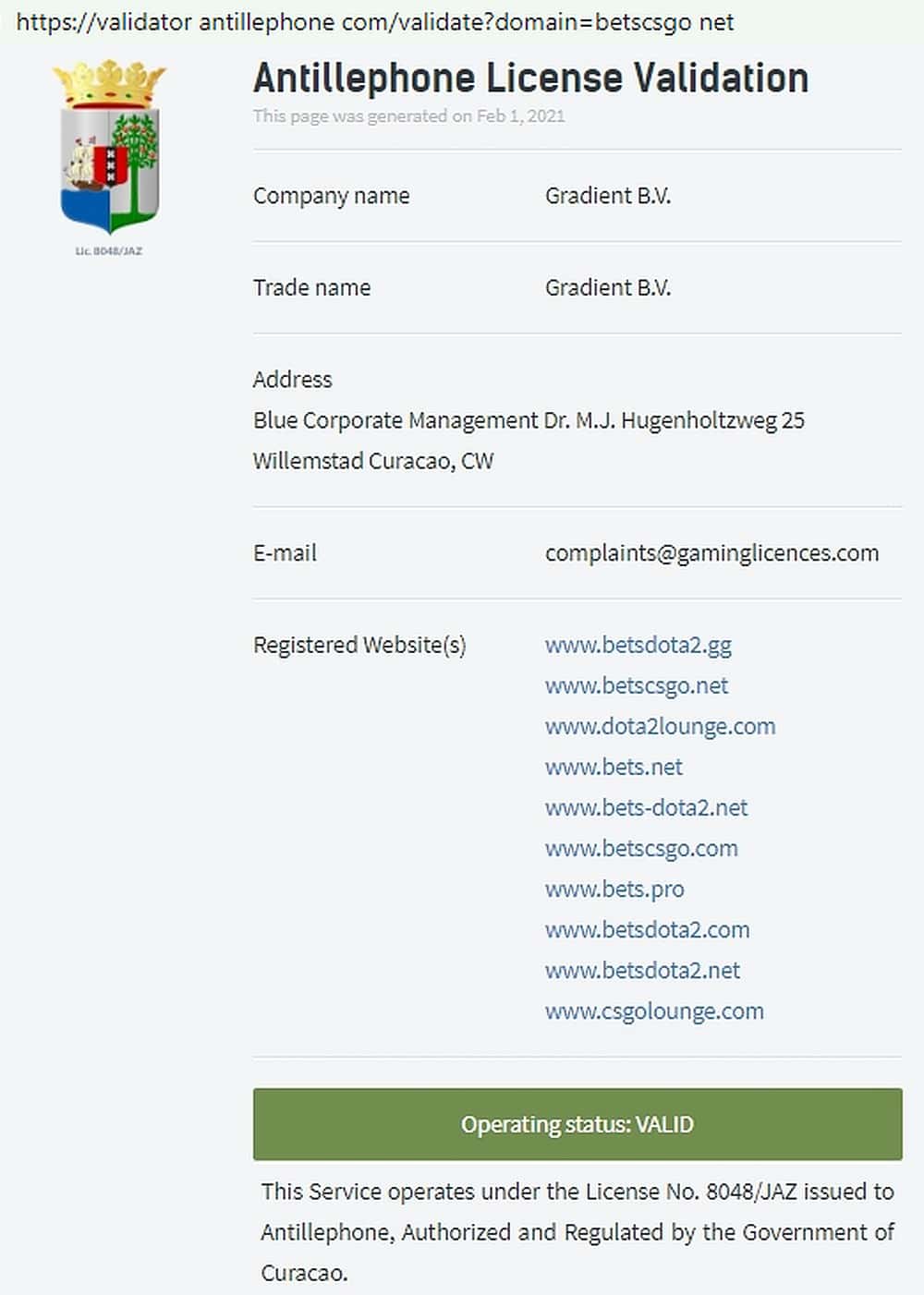 Жулики Бетс КСГО на своем сайте указали, что деятельность их гнилого гэмблинг-лохотрона регулируется оффшорной помойной структурой Антиллефон (antillephone com).