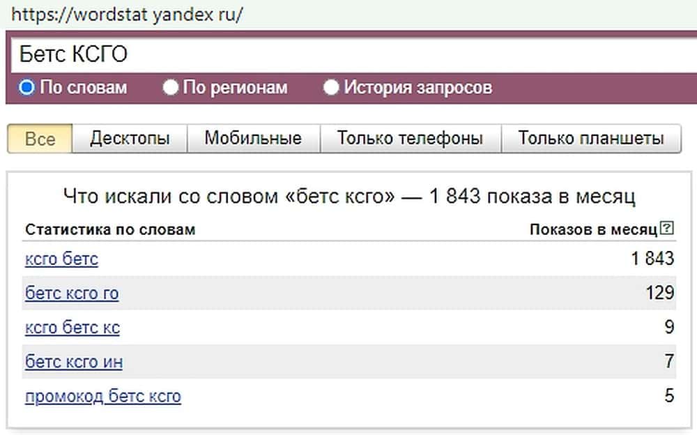 Запрос "Бетс КСГО" поступал к серверам компании Яндекс 1843 раза за месяц, а это свидетельствует уже о довольно высокой востребованности этого игрового лоходрома.