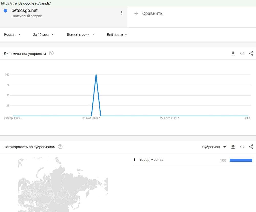 Бренд мошенников "БетсКСГО" искали с помощью веб-сервиса Гугл, преимущественно жители столицы России. Но, можно увидеть, что частота поиска, не такая уж и впечатляющая.