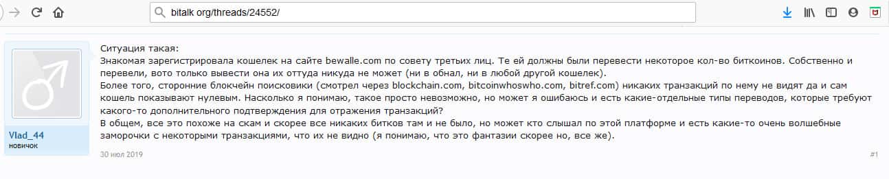 Очередной пользователь не может вывести деньги из шаражки BeWalle Com