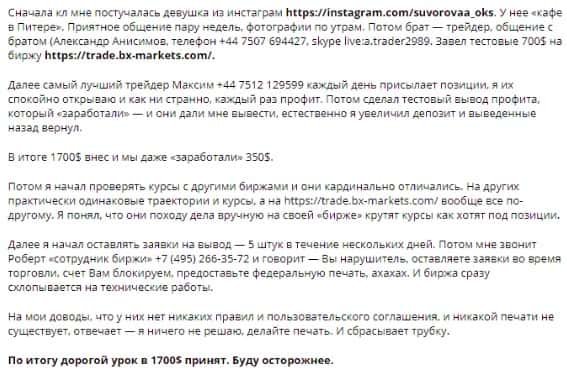 Мошенники из брокерской компании BX-Markets под видом прибыльной торговли привлекают доверчивых трейдеров, а на самом деле обманывают их и не выводят деньги.