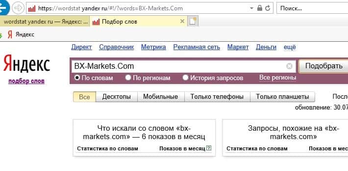 Популярность поисковых запросов по названию бренда "BX Markets Com" без точки и с пробелом вместо дефиса на сайте wordstat yandex ru тоже составила 6 показов.