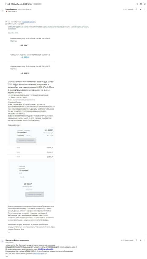 Одна женщина попалась в очень неприятную ситуацию, при чем на первых порах, она сама дала возможность снять деньги мошенникам и положить на счет дилинговой кухни БХ Трейдер. Поначалу она перевела около 10 000 рублей и аналитики наторговали где-то пару тысяч рублей, которые они разрешили вывести для показухи. Но, так как у жуликов был доступ к интернет-банкингу свое жертвы, то они, как отвлекающий маневр, заставили клиентку проходить верификацию, а сами, тайком сняли почти 90 000 рублей. Сразу же на следующий день, позвонил Александр Громов и сообщил, что они могут вернуть деньги, только на другую карточку, в связи с тем, что деньги эта была заблокирована. А на тот момент у жертвы лохотрона была кредитная карта другого банка и она передала все данные мошенникам. Как результат еще 120 000 рублей с карты Тинькофф Банка было успешно снято аферистами BX Trader. Женщина имеет все доказательства того, что эта контора ее обманула и без разрешения сняла с банковских счетов все ее деньги. Наступил новый год и сайт уже не работает, а вместе с тем и исчез доступ к личному кабинету.
