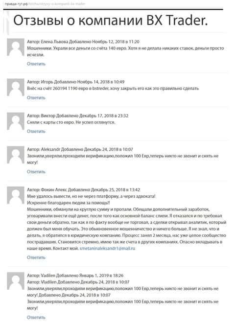 Не менее примечательный материал также был найден на сайте brokertribunal com. Пострадавшие клиенты форекс-лохотрона БХ Трейдер делятся своим плачевным опытом сотрудничества с этим явно жульническим брокером.