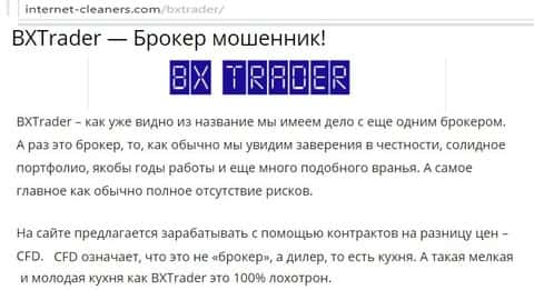 Далее предлагаю ознакомится с информационным материалом веб-площадки internet-cleaners com, где также пишут о мошенниках сети Интернет, которые называют себя брокерской организацией БХ Трейдер.