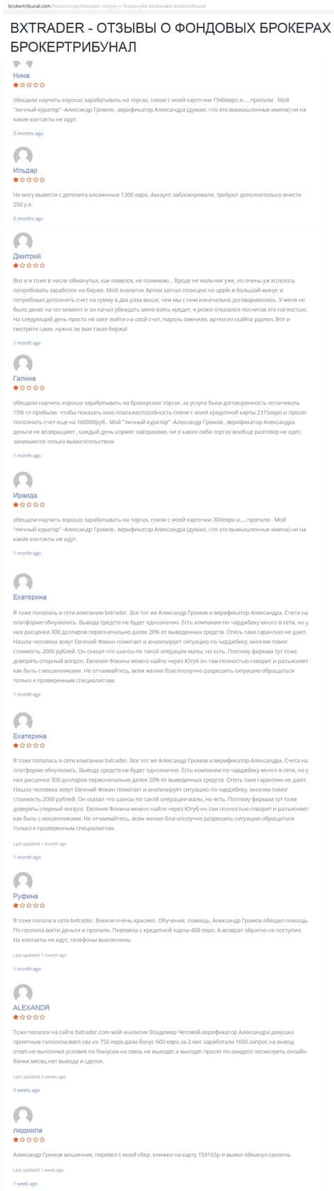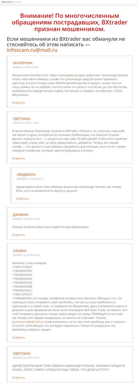 На публикациях, которые приводятся в данном разделе статьи о компании БХ Трейдер, представлен информационный материал, который дает понять: открывая счет в конторе BX Trader, пользователь глобальной сети имеет дело с очередными аферистами Forex. Начинает перечень публикация, взятая с веб-площадки отзовика infoscam ru, где авторы комментов один за одним пишут о том, что мошенники БхТрейдер развели их на немалые суммы, а также повесели долговые обязательства перед банками.