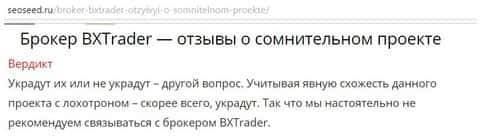 А завершением данного раздела статьи о кухне БХ Трейдер является информация специализированного сайта seoseed ru, которые специализируется на проведении анализа деятельности того или иного потенциального интернет-мошенника. Вердикт веб-сервиса сеосид ру можно увидеть на публикации ниже.