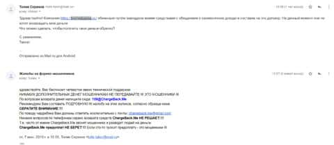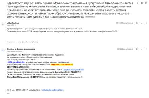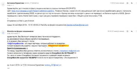 Следующим информационным материалом о шарлатанах Forex в лице компании Би Крипто Ареа является очередная жалоба от одного из пострадавших клиентов данной форекс-кухни. В ответном письме человеку советуют обратится в специализированный сервис ChargeBack.Me за помощью.